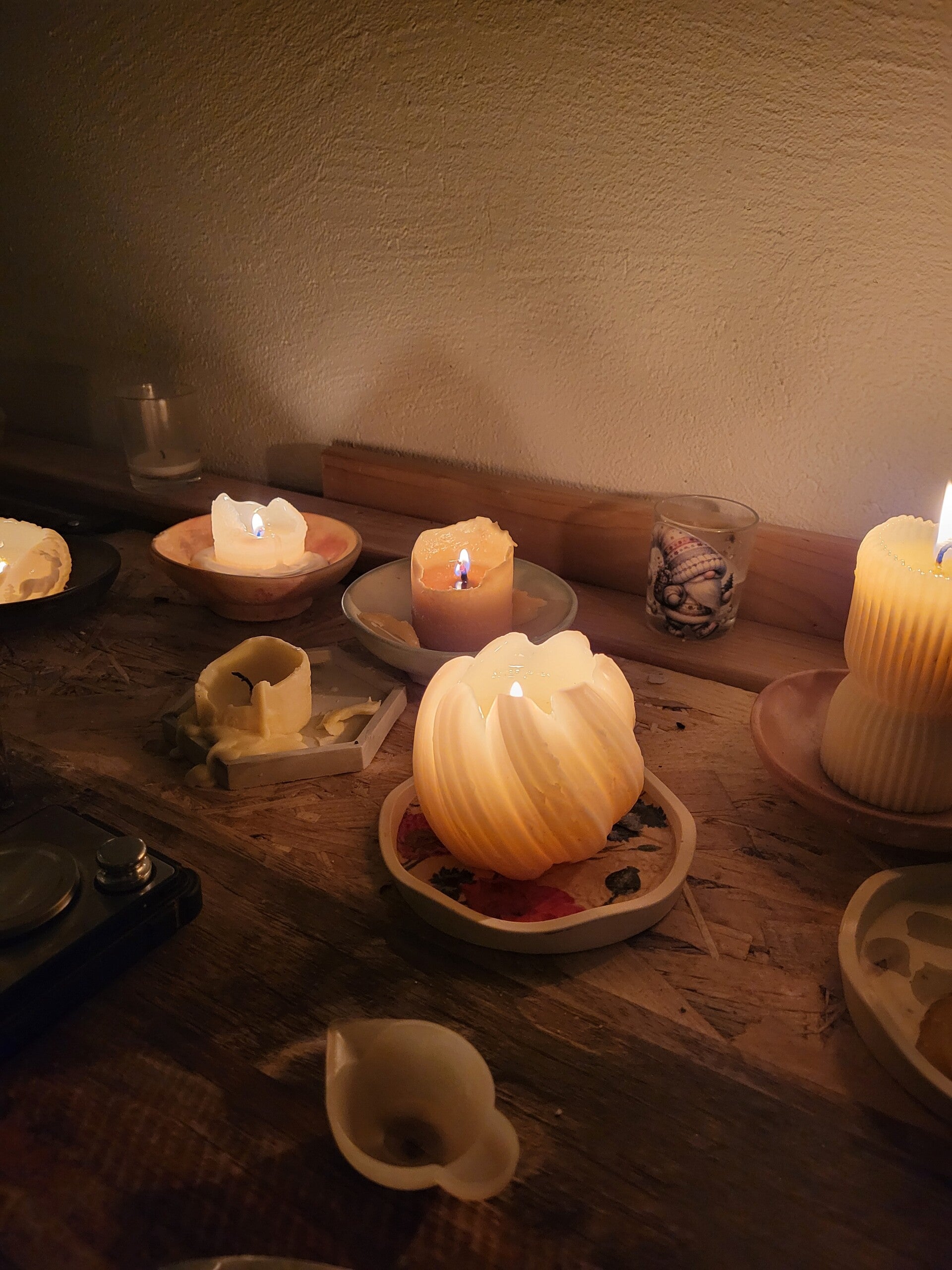 Je privilège des petites séries, coulées à la main, avec des matériaux choisis (cires européennes, béton et Jesmonite) et beaucoup de tests pour obtenir une flamme stable et un parfum discret.
