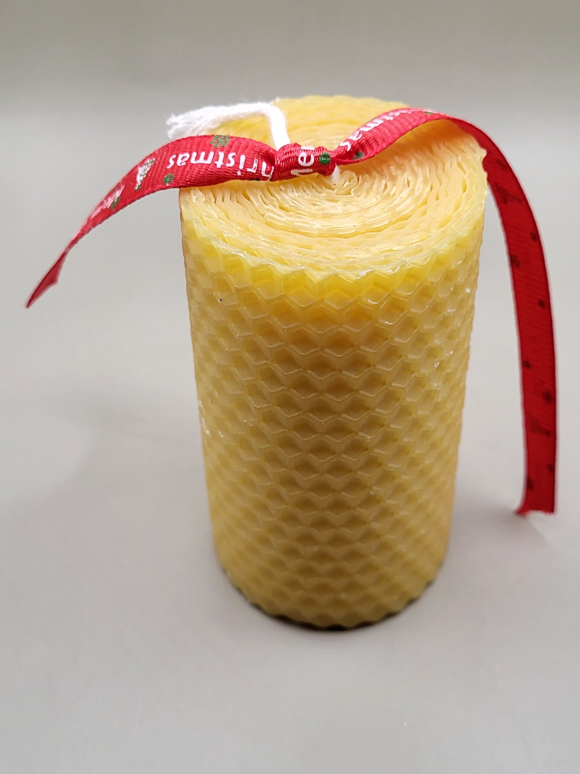 Bougie pilier en cire d’abeille 100 % française, façonnée à la main et texturée d’un relief nid d’abeille.