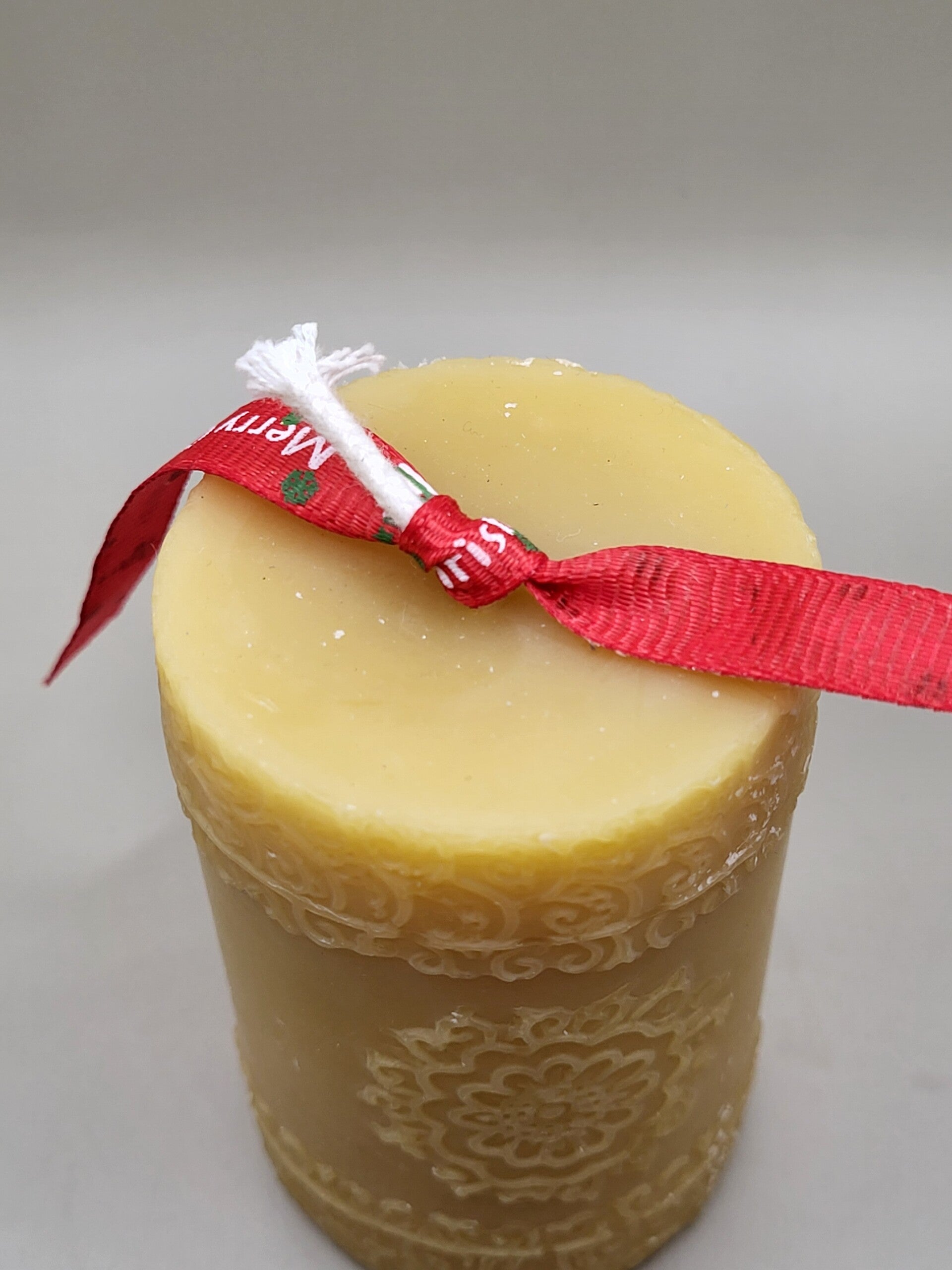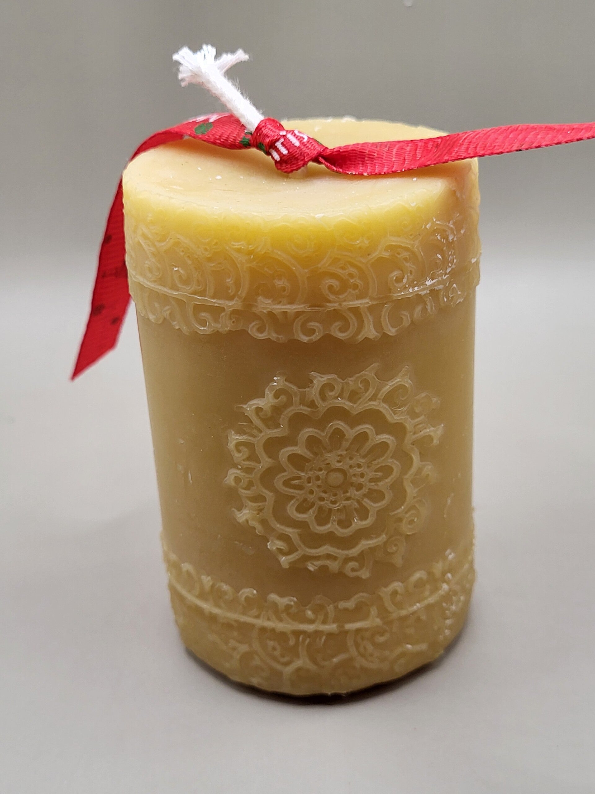 Bougie pilier en cire d’abeille 100 % française, avec un motif mandala en relief.